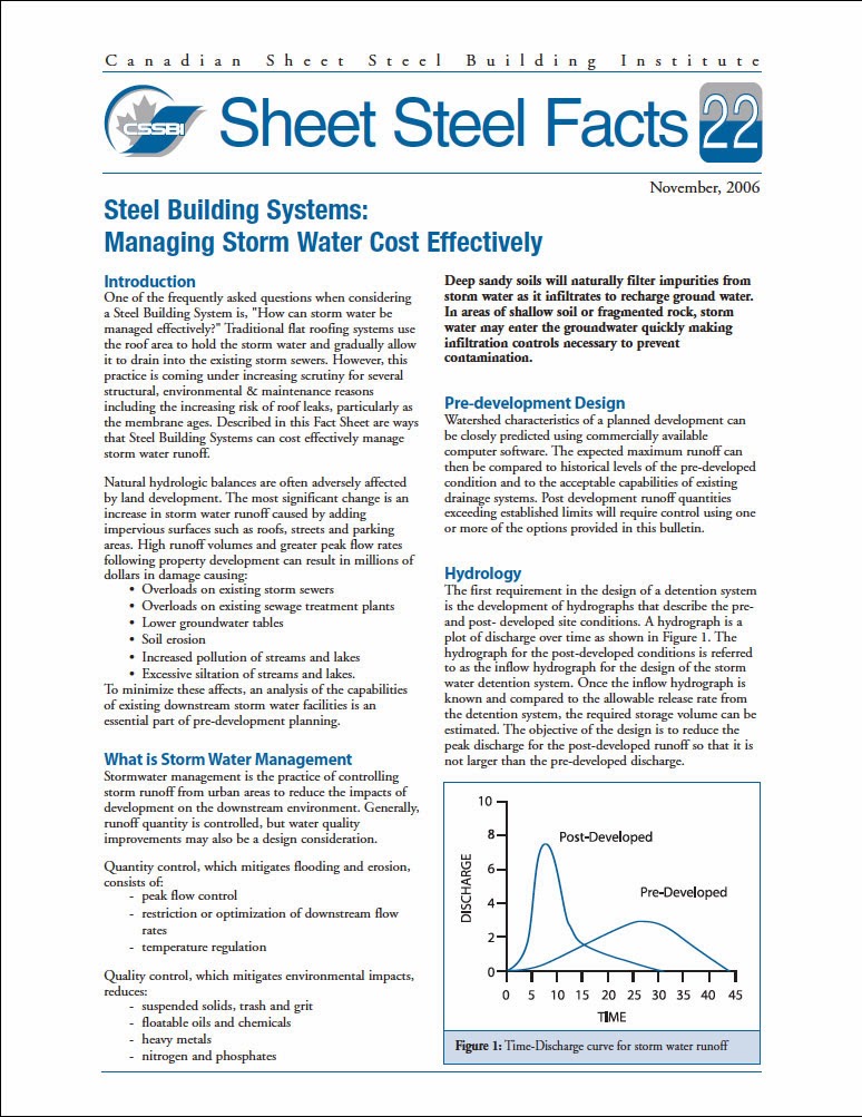 One of the frequently asked questions when considering a Steel Building System is, "How can storm water be managed effectively?" Traditional flat roofing systems use the roof area to hold the storm water and gradually allow it to drain into the existing storm sewers. However, this practice is coming under increasing scrutiny for several structural, environmental & maintenance reasons including the increasing risk of roof leaks, particularly as the membrane ages. Described in this Fact Sheet are ways that Steel Building Systems can cost effectively manage storm water runoff.